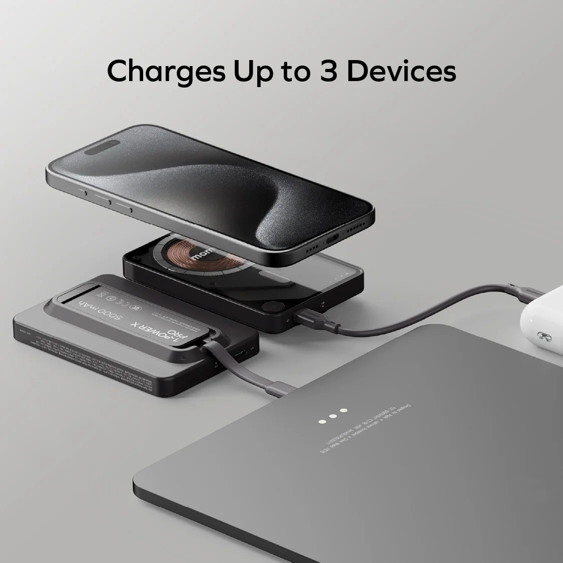 同時為3個裝置使用USB-C接口進行無線充電。內置 USB-C 充電線,方便隨時直接充電。告別纏繞的電線,及非常適合多裝置使用的人。