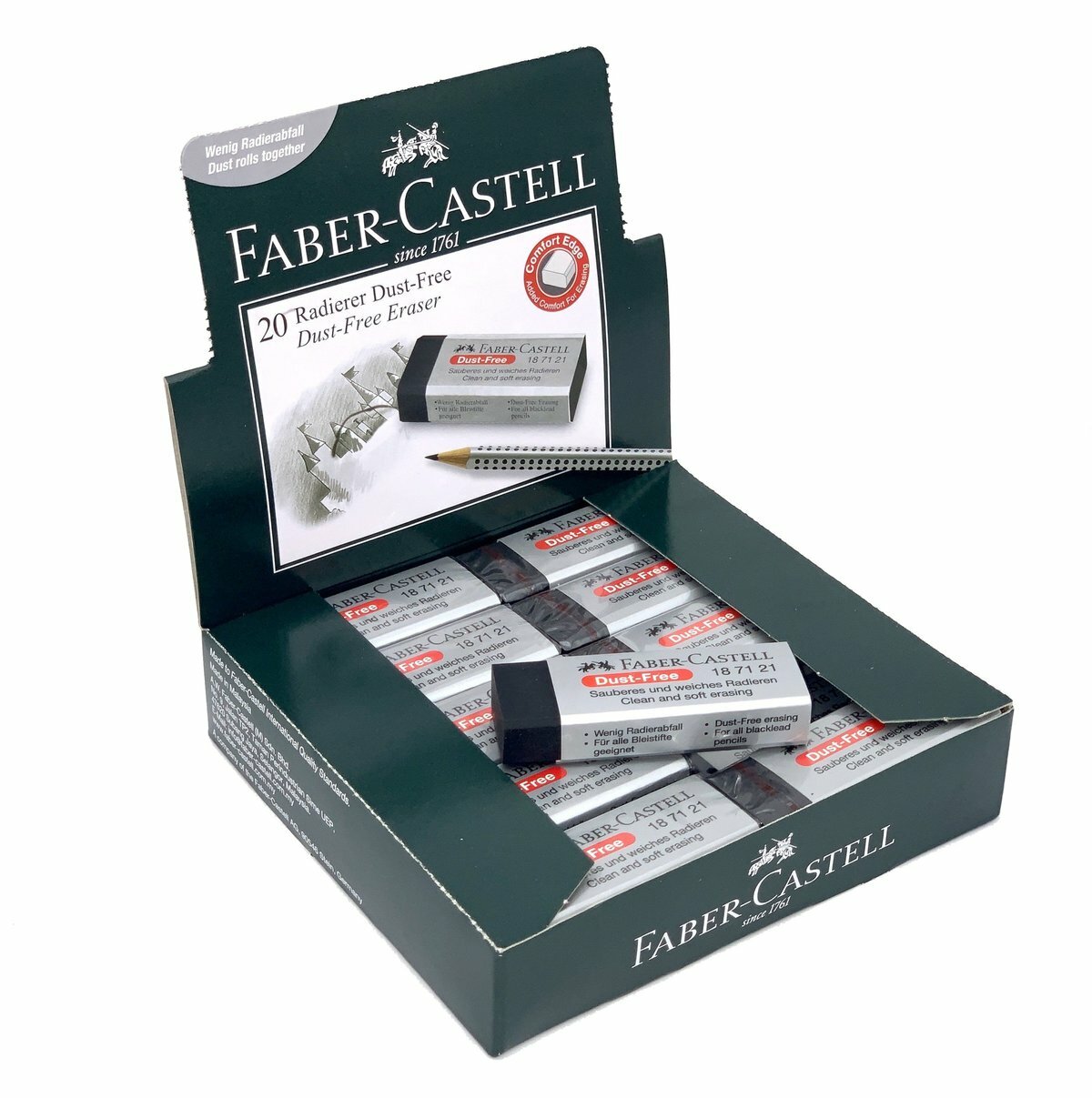 Faber-Castell無塵軟擦膠系列在清潔擦除方面提供最佳性能。它還不含有害的增塑劑-鄰苯二甲酸酯。獨特的“無塵”配方使橡皮擦柔軟,並保證出色的清潔和無污跡擦除。橡皮殘留物和灰塵很容易一起滾動,以便於清潔。精心設計的舒適邊緣(倒角)可精確擦除並防止破損。此外,橡皮擦不含乳膠,經過皮膚病學測試和認可。