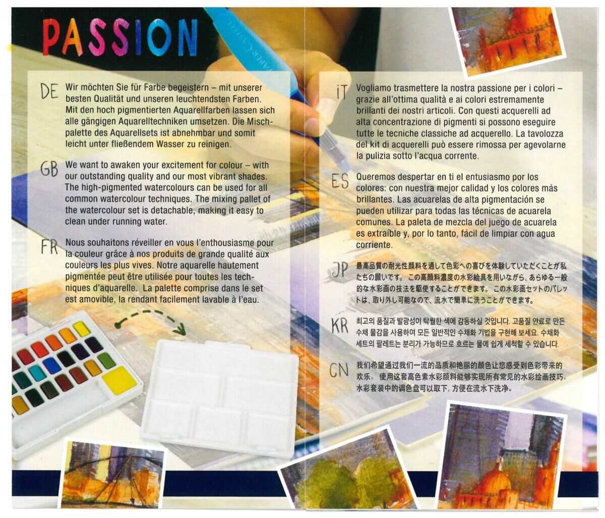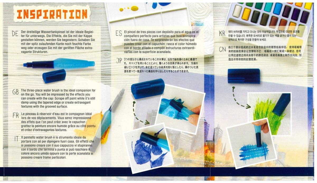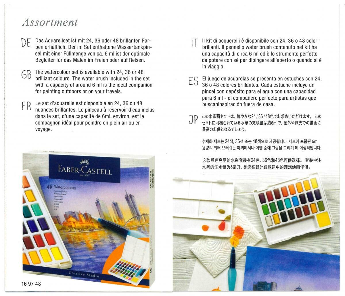 Faber-Castell將為初學者和業餘藝術家提供三套鍋具水彩畫,附畫筆掃和可拆卸的混合調色盤。 所有常規的水彩技術都可以顯現高質著色的水彩畫。 所提供的水筆可以產生多種奇妙的效果,是戶外或旅行中繪畫的理想伴侶。 鮮豔明亮的色彩(包括金屬色和霓虹色)給用家留下了深刻的印象,為他們提供了支援,並為他們的創造力帶來了喜悅和表達能力。