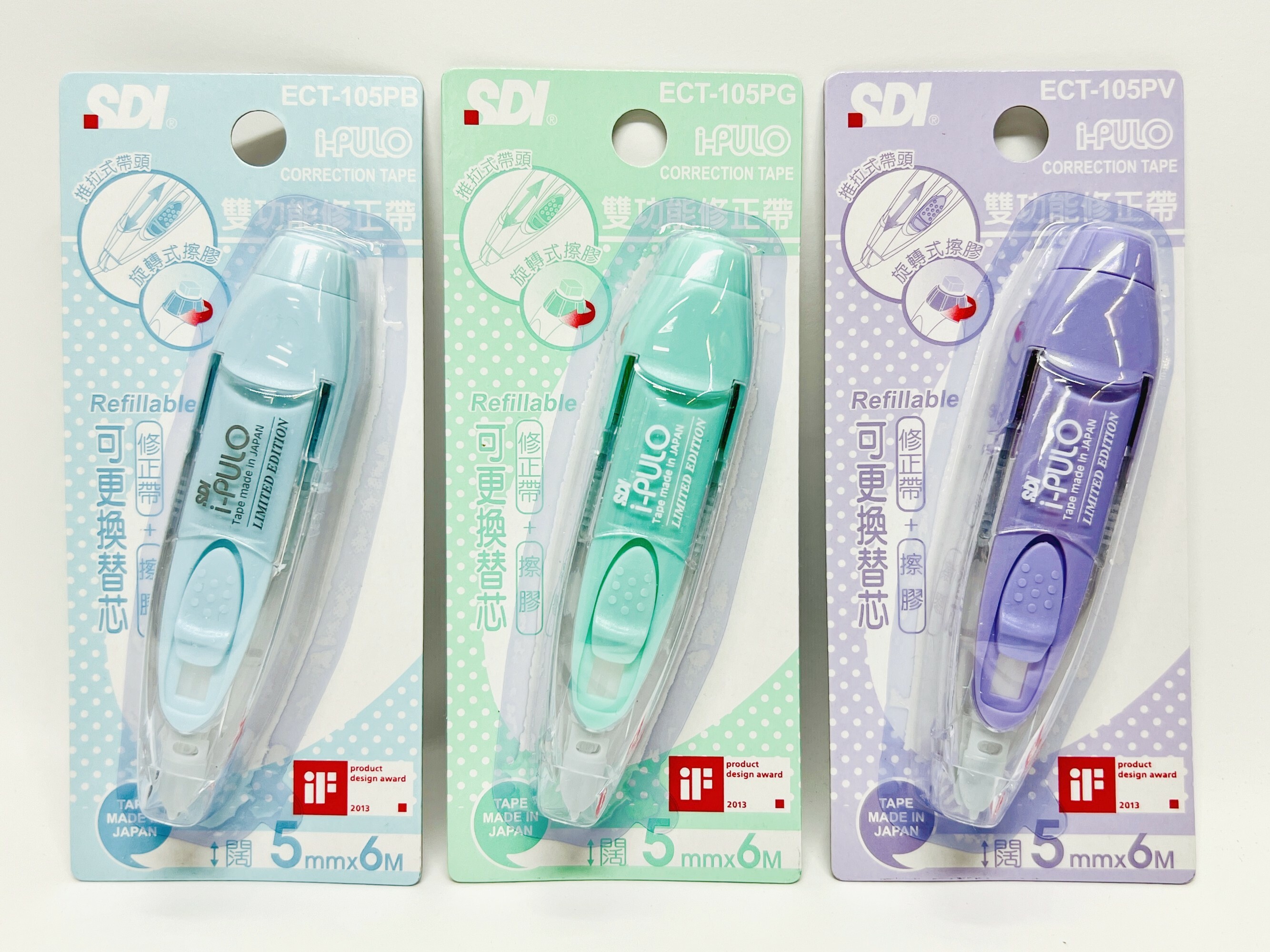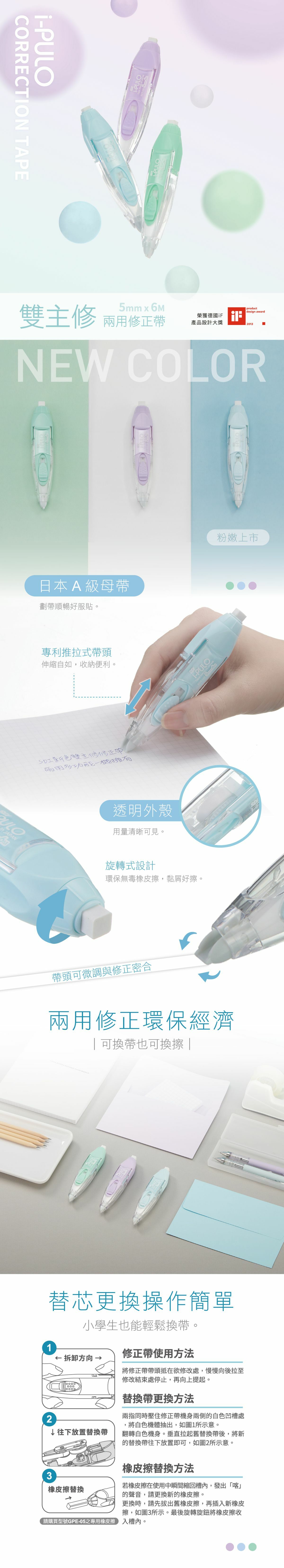 可配iPULO"雙功能塗改帶替換芯: ECT-104R (4mm x 6M) 、ECT105R (5mm x 6M)、ECT106R (6mm x 6M)