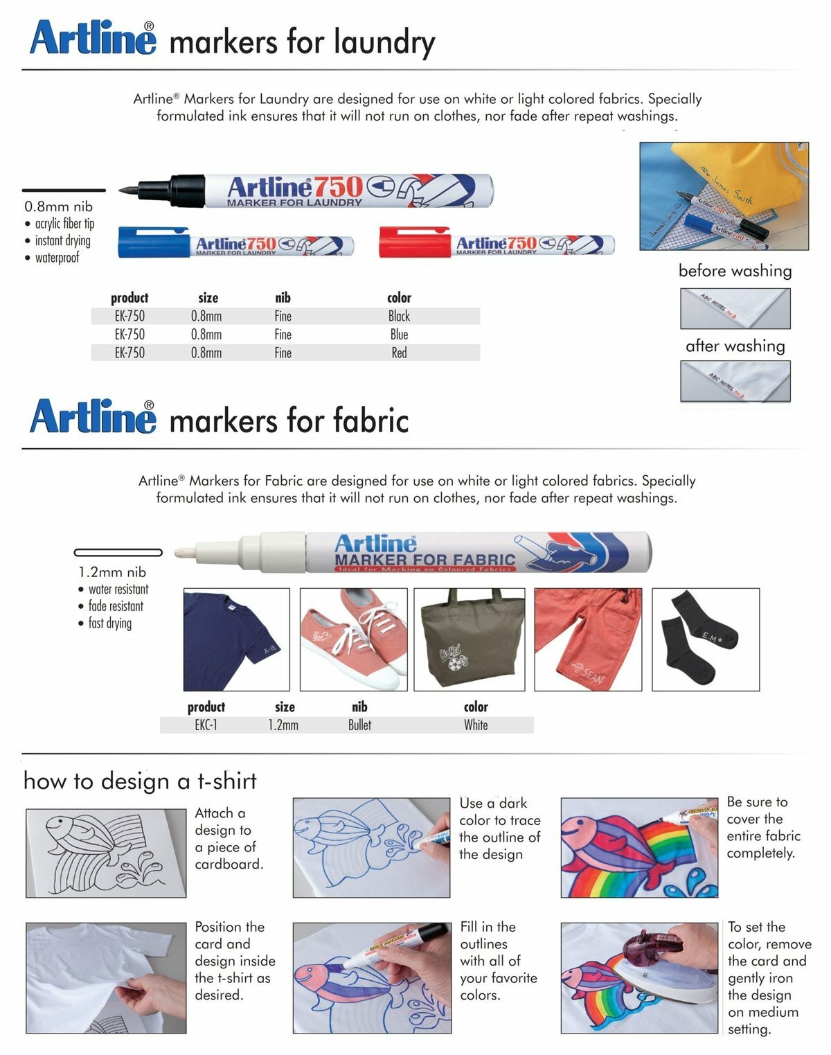 Artline 750中的墨水可承受用清潔劑,冷熱水反复洗滌的能力,並且耐乾洗。 標記任何類型的布料,亞麻布,衣物等的理想選擇。